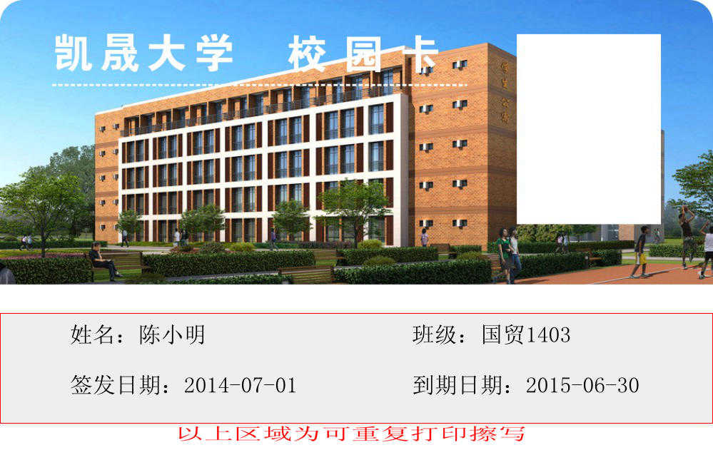 應用詳細:普通的校園卡可以做為一卡通使用,但是卻沒有可復寫的功能,無法體現校園管理的人性化以及其便捷性。深圳凱晟為您提供整套校園可視卡方案,讓你使用無后顧之憂,可視校園卡制作使用過程可雙面高檔印刷,正面留出條膜(或覆蓋全膜)和1寸頭像的區域,學校可以通過證卡打印機把學生人像打印上去,可視膜覆蓋區域可以打印學生個人信息,由于可視卡的可擦寫性,信息可以隨時根據需要做修改,反復擦寫次數高達500次,對于臨時使用的校園卡也能很好達到出入管理的效果,學生個人信息修改,也可直接擦除打印,不需重新制作卡片,減少卡支出成本,這就是可視卡的優勢,直觀顯示卡片信息,可以反復打印擦寫。